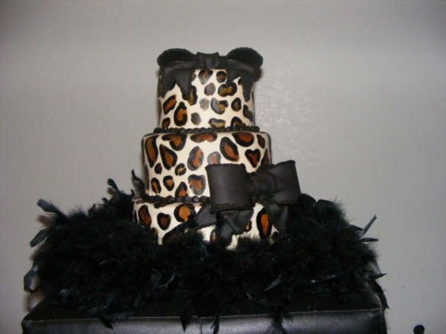 This was a for an untraditional bride.......I loved that. Just painted on leopard spots on fondant with black boa trim. TFL.