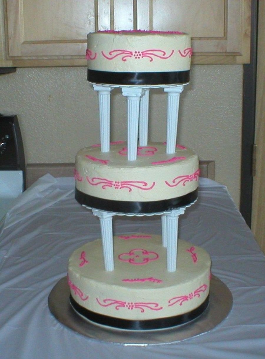 White cake with buttercream frosting & strawberry filling. There is just something about this cake that I didn't like. We used the spiked tiers and they wouldn't attach to the boards good and when we put one set of them on it looked crooked. So i was waiting all night for a phone call that it fell but never heard a word. This was a 12,10,8