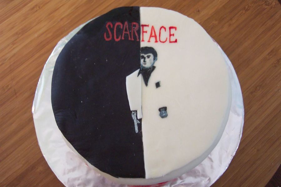 Made for a friend who wanted a scarface cake in memorial of her son. Triple chocolate cake, covered in vanilla BC, and then covered in MMF. Handpainted the top.