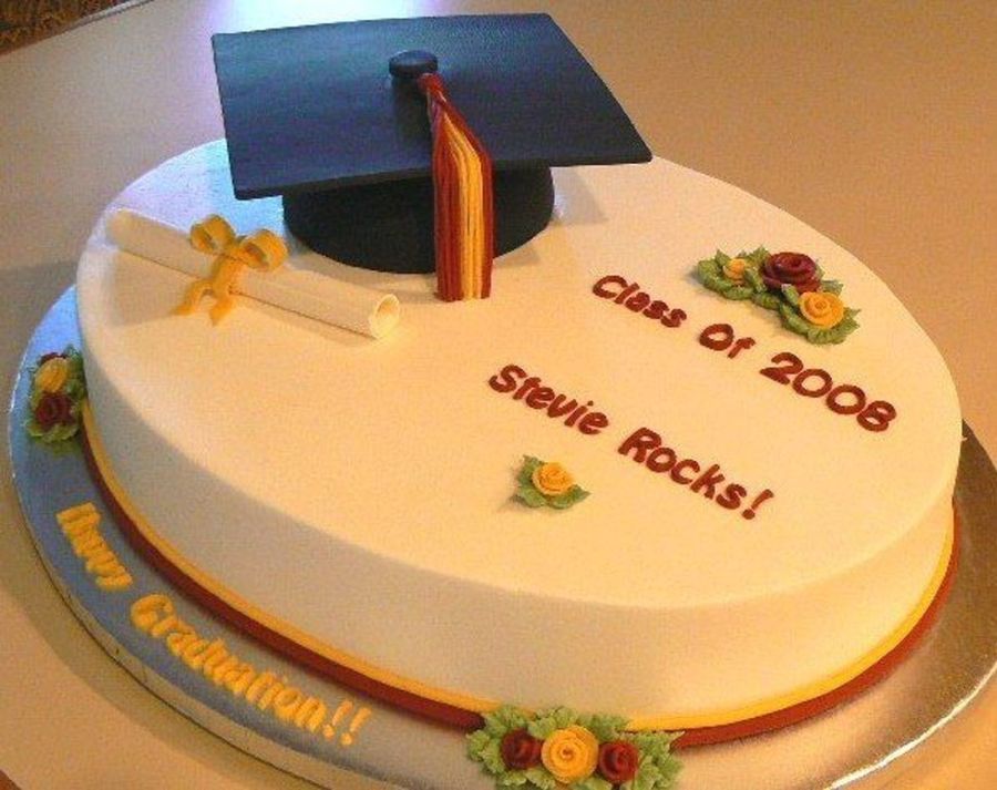 Large oval yellow cake iced with buttercream. Everything is edible except the bottom part of the cap - half of a styrofoam ball covered with fondant. My thanks to SugarShack for help with that! Diploma is rolled gumpaste. Tassel is fondant. Fondant lettering is made from JEM letter cutters