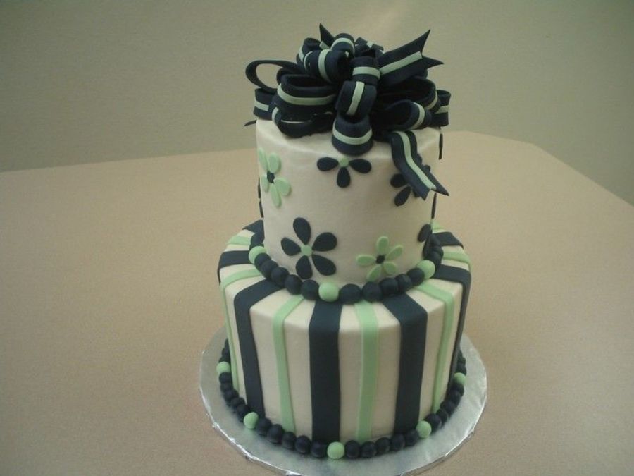 Shower cake for a bride whose wedding colors were navy and celery (whatever that means) :). Six inch carrot with barvarian cream, nine inch chocolate with coconut pecan filling. Coconut BC. Alll decorations are fondant. Thanks for looking!