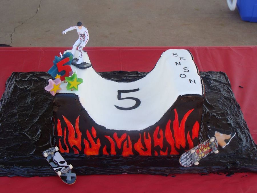 Tony Hawk, half pipe for my son's 5th birthday! I searched for weeks for the right sized Tony Hawk figure, but ended up gluing speed racer to a skateboard instead!!