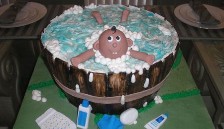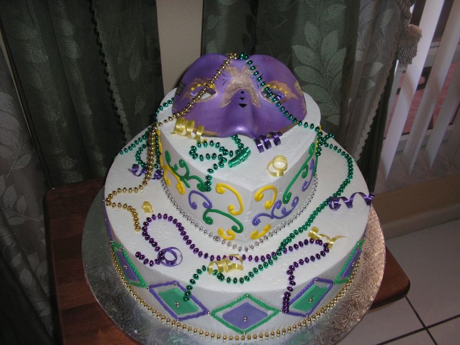 Buttercream w/fondant decoration and gumpaste/fondant mask. Beads are non-edible.