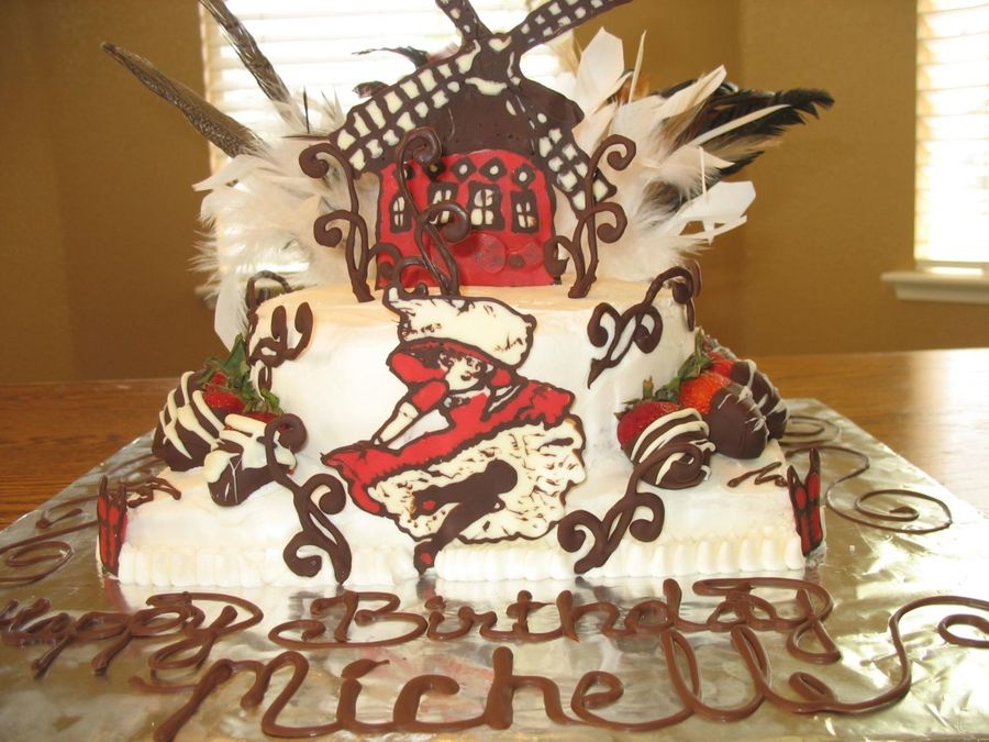 This is my third cake, I really like the way it turned out. White cake with buttercream frosting. I did my first chocolate transfers for the windmill and Can-Can girl. Chocolate swirls and chocolate covered strawberries. This cake was so much fun! I surprised a friend for her birthday...she loved it!