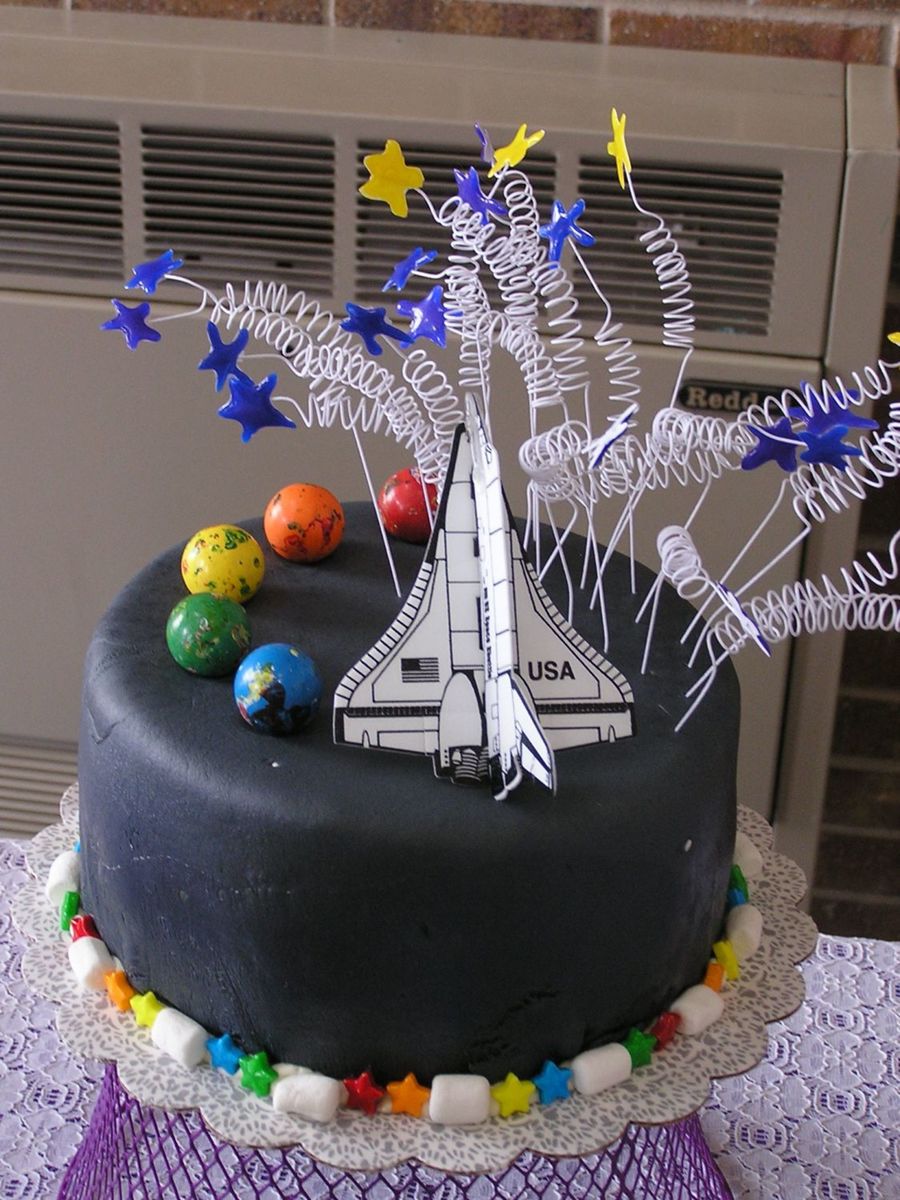 Second in my series of 5 retirement cakes. Covered in black MMF and trimmed in marshmellows and star candies. Topped with a small space shuttle glider; 5 jaw breakers (to look like planets); and 23 stars on spiraled floral wire (one for each year my mom was at her school).