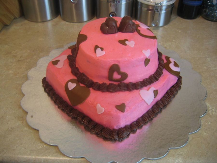 This is my 1 st cake to be paid for...YAY!!!! All bc with home made fondant hearts. chocolate heart candies on top. Inside both chocolate cake, bottom is torted with chocolate filling & top is torted with chocolate & peanut butter mixture filling