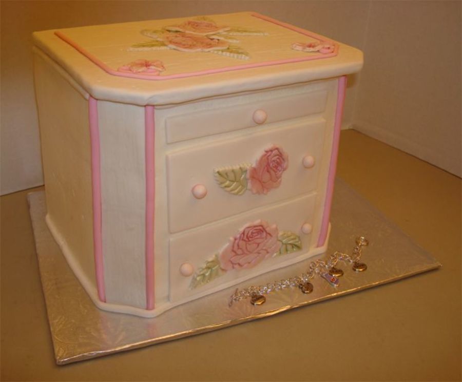 This was made from 4 layers of 8x8 cake stacked,doweled and iced . The top was cardboard covered in fondant and decorated.