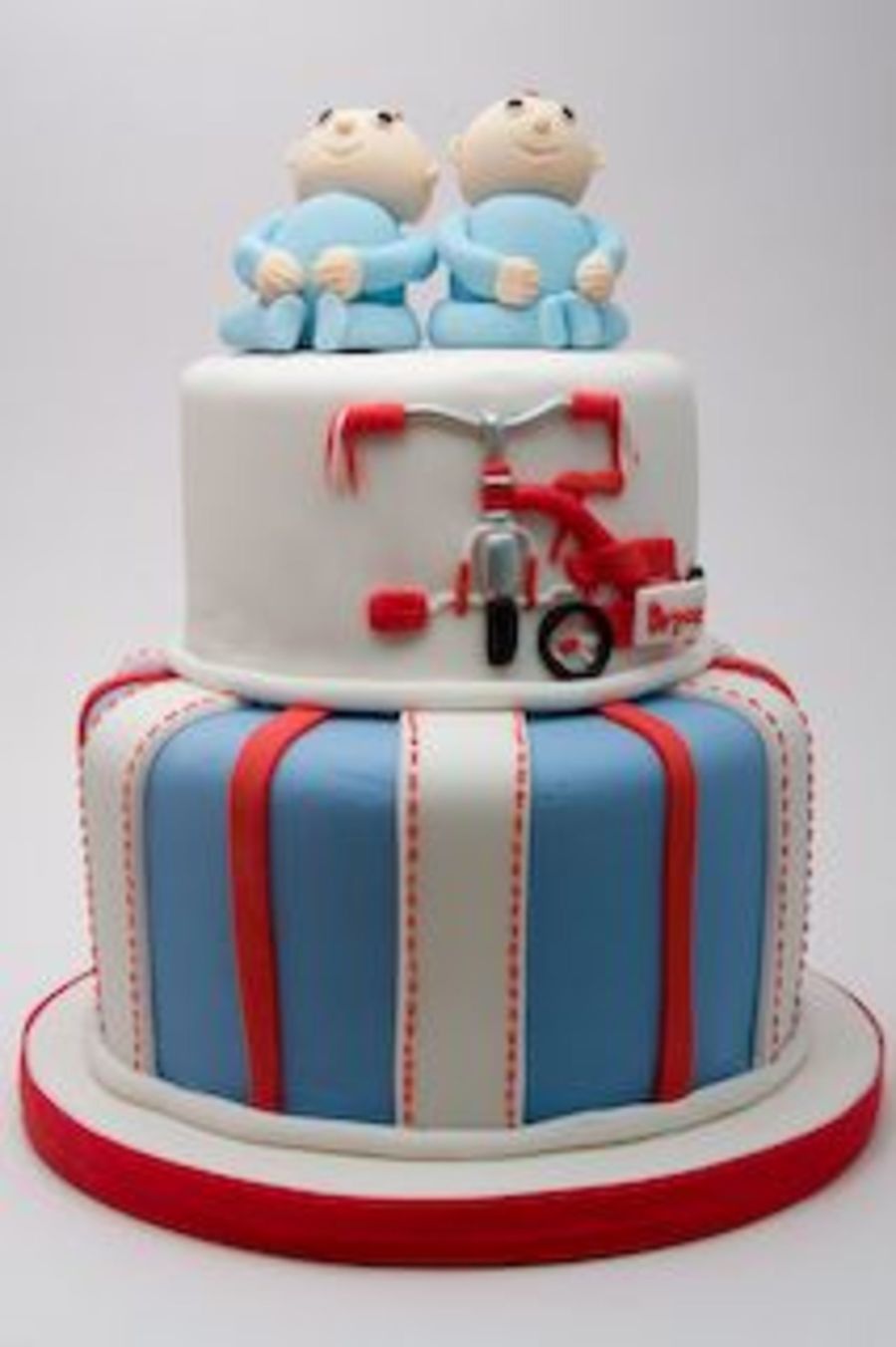 Parents are pro cyclists, tricycles on the invite, hence the tricycle on the cake. There is another trike on the opposite side of the top tier with the other baby's name on it. Babies are fondant, trikes are a mix of fondant and royal icing. Silver is silver highlighter dust.