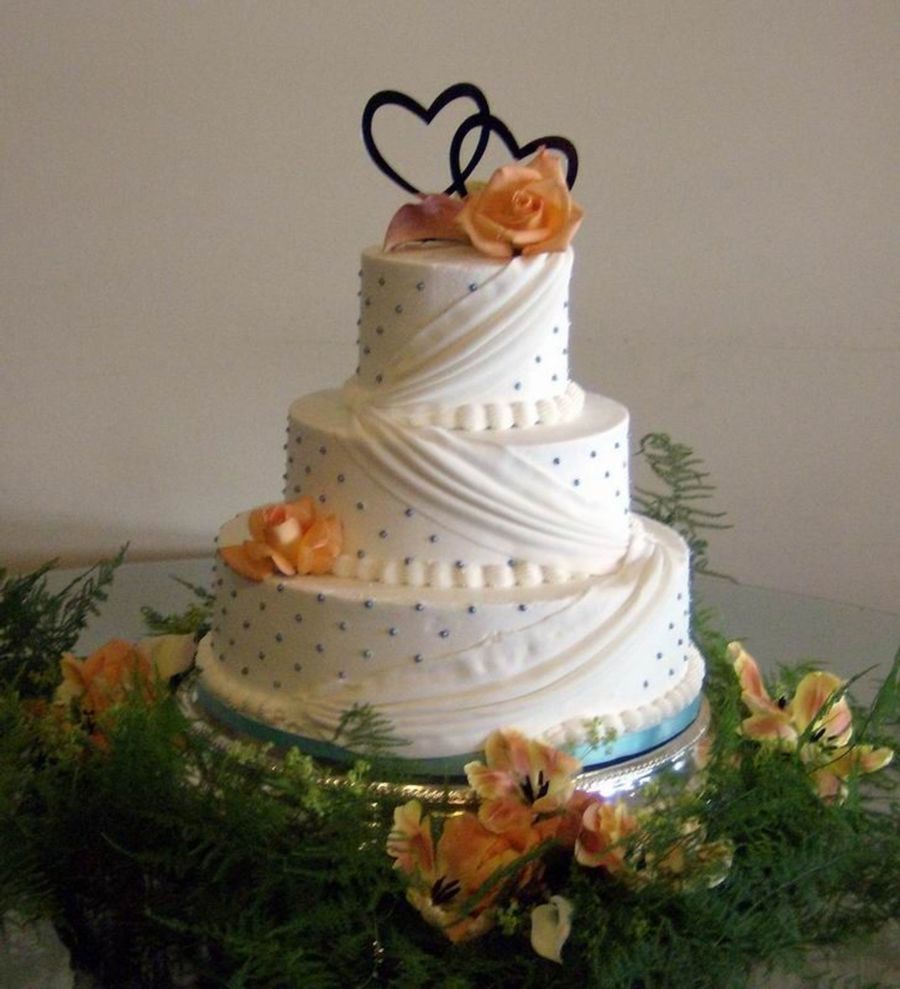 14", 10", 6" - Buttercream icing with teal colored fondant pearls and fondant drapes (my first time doing drapes). Fresh flowers, which the florist put on and put them in the wrong place.