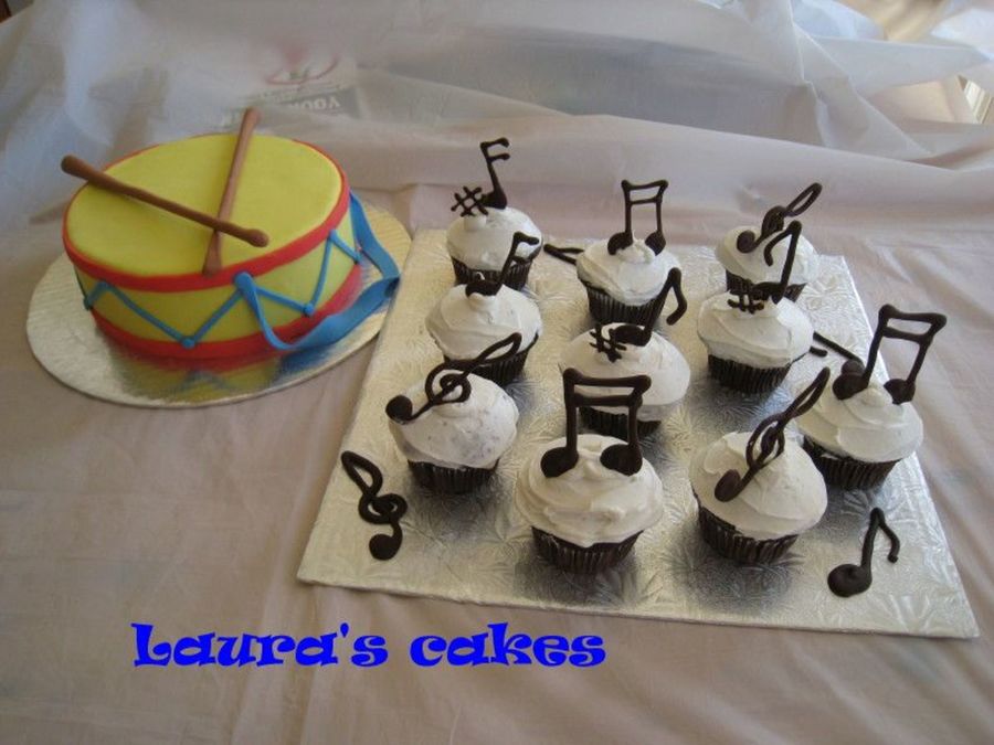 Cake and cupcakes for a music themed party. Ideas taken from cakes here. Thanks for the inspiration!