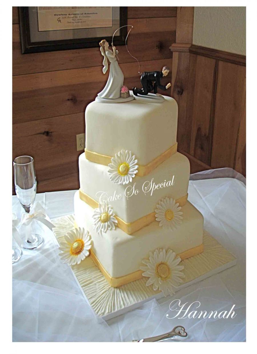 Gum paste daisies on a small 6, 8, 10" square cake. Small yellow border. TFL