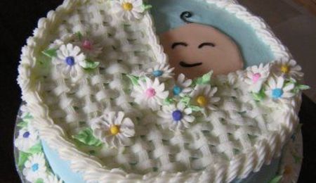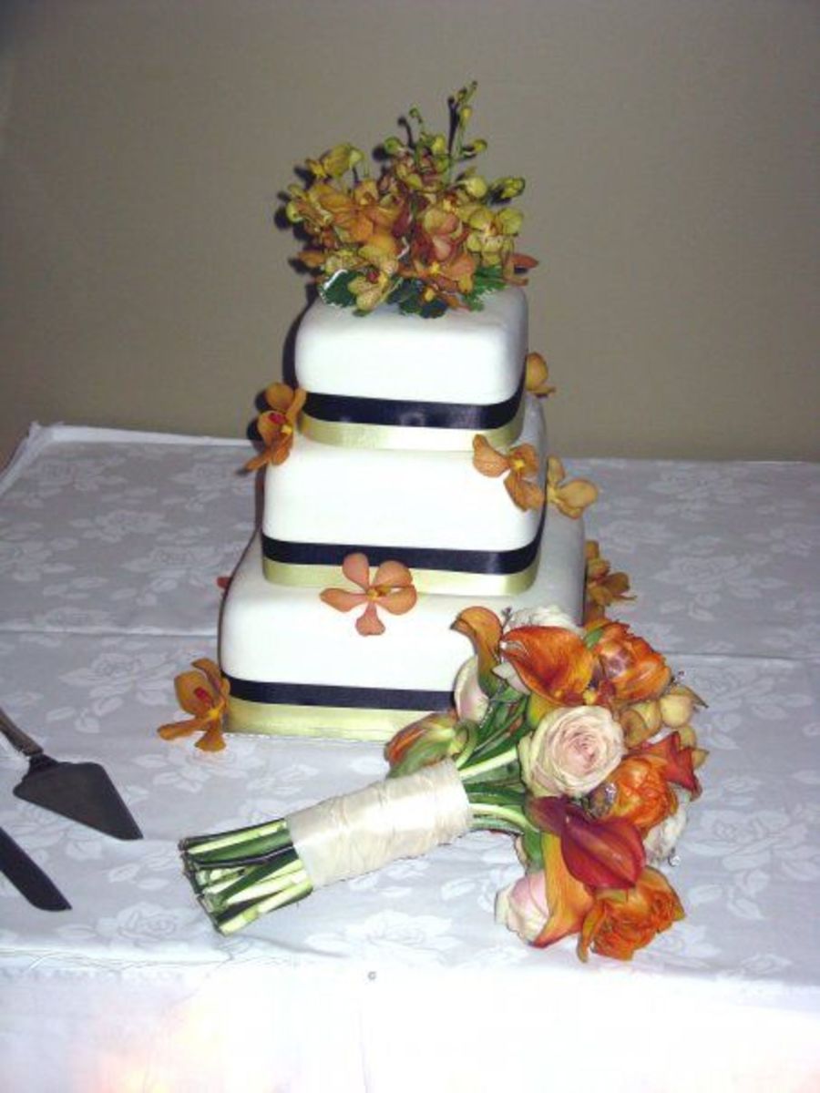 Fondant with satin ribbon and fresh flowers.