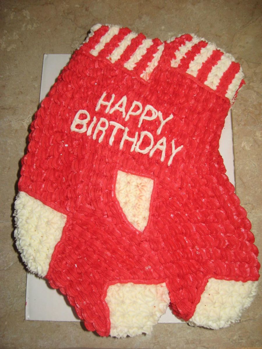 This was for a Red Sox fan. Yellow cake with almond-rum icing. Red was piped in rows of shells to resemble 'knitted rib' look. White accents were piped stars. Lettering was piped with a round tip then 'stitched' with a wet brush.
