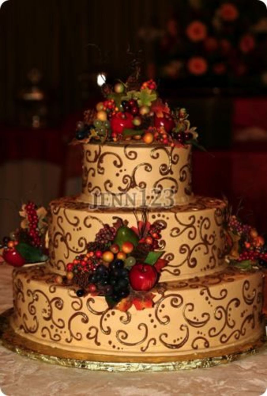 Chocolate cake with peanutbutter filling. Tan icing with brown and painted gold accents. Silk/plastic fruits and greenery.