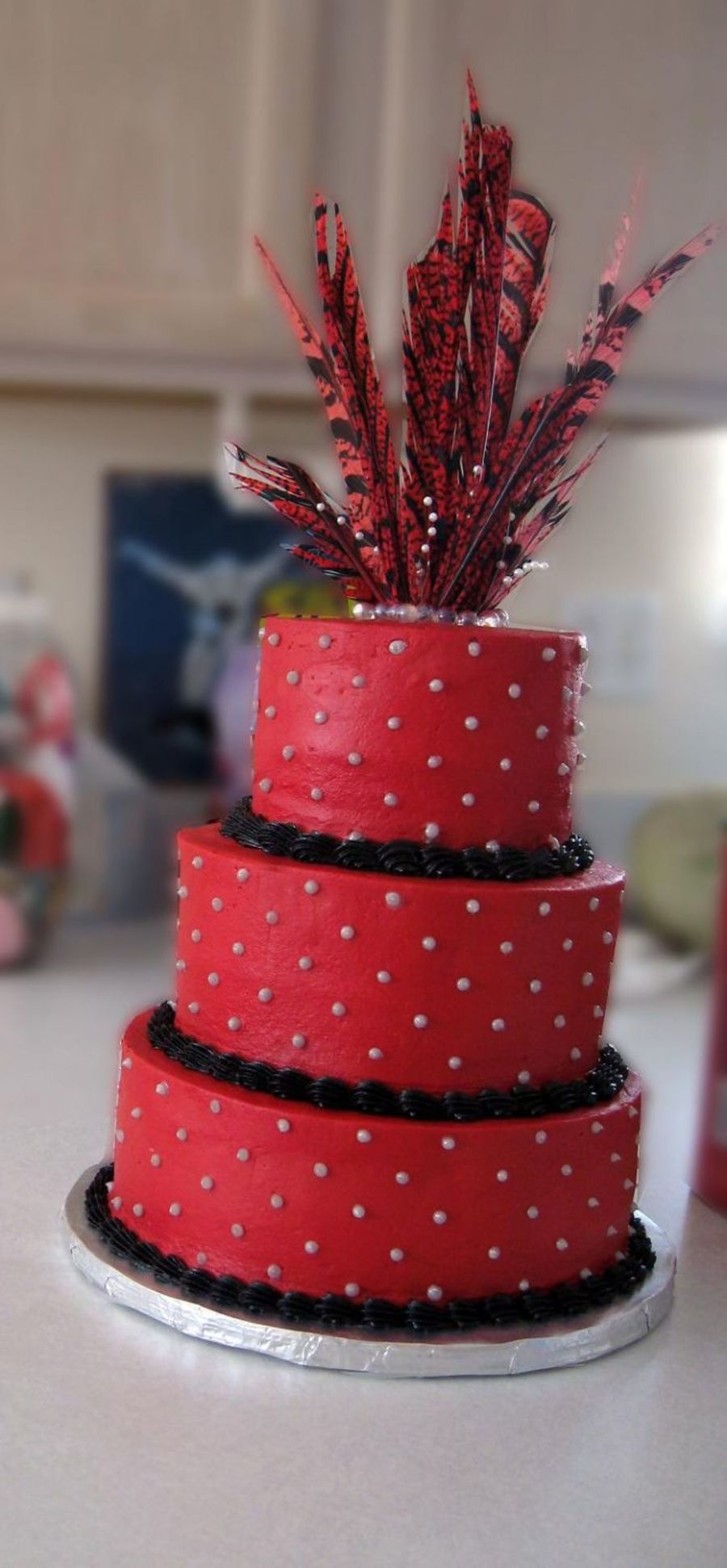 Customer wanted this design with a feather topper, not my favorite design but it's what they wanted. 3 tier - 10, 8, 6" iced in buttercream with feather topper. Thanks for looking!