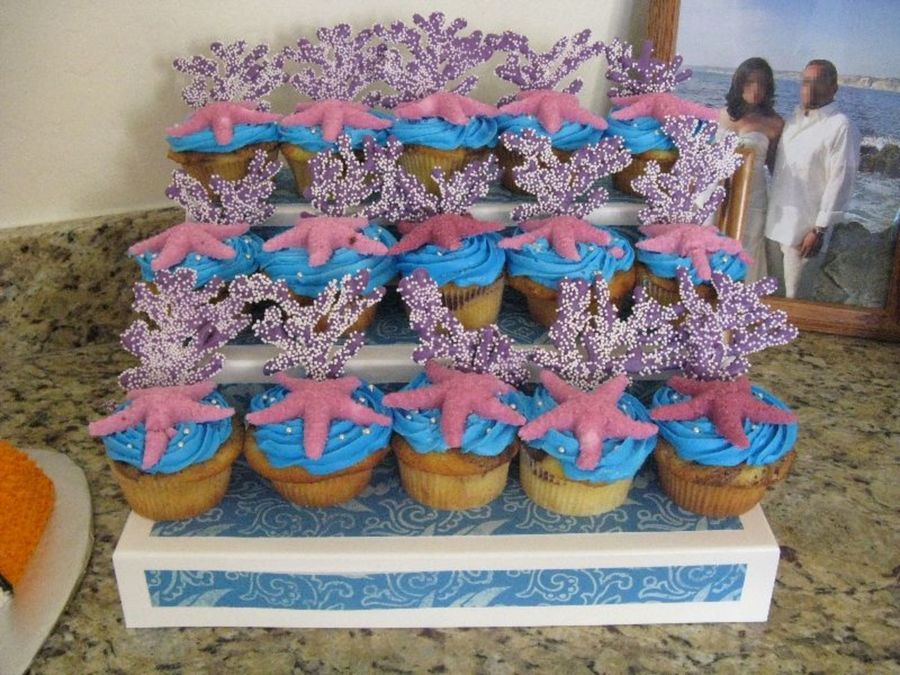 Marble cake with cream filling. The starfish is sugar molded and the coral is purple tinted white chocolate piped on wax paper and covered in white sprinkles. These were to go with the Nemo cake. TFL!