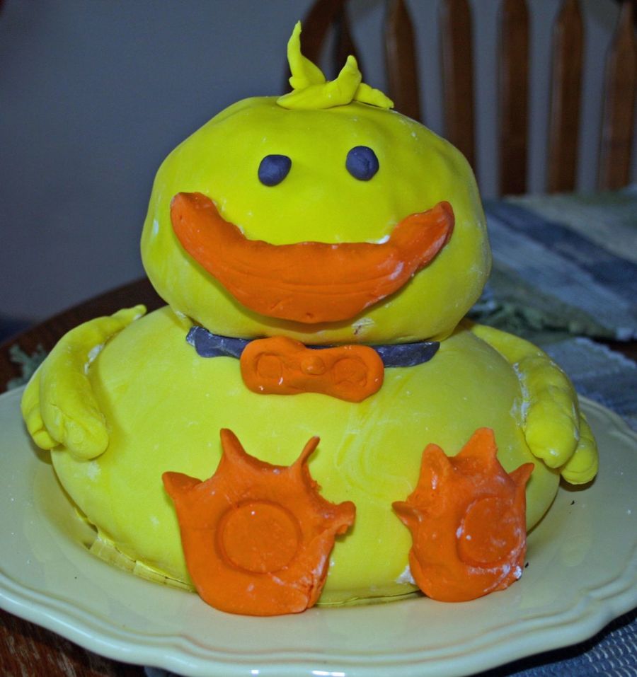 This is my Easter cake I made. It is (suppose to be) a duck. It is covered in fondant and one of the hardest cake i have ever made since im 12. My mom helped me with the beak because it kept falling down.. For the eyes, mouth/beak I put a peice of angel hair pasta to keep it still..