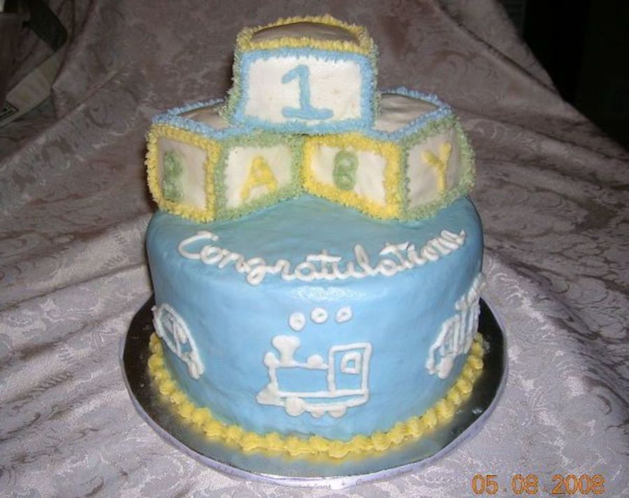 White double layer 8 inch rounds with sculpted blocks on top. Had a hard time covering the blocks with BC (there was a lot of icing on the blocks :) Free-hand drawings of train, truck and car on the front and sides. I was pleased with how it turned out. TFL!