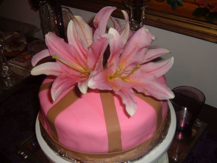 This cake is covered in Pink and brown fondant and topped with fresh lillies