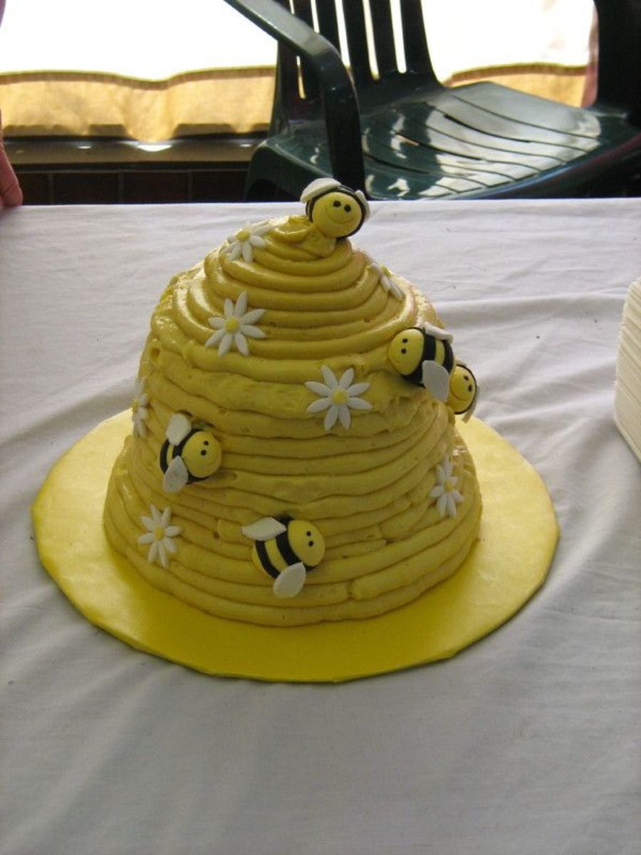 80th Birthday cake for the lady who sells honey at the farmer's market I sell at. Chai tea cake with honey cinnamon SMBC. Fondant bees. TFL