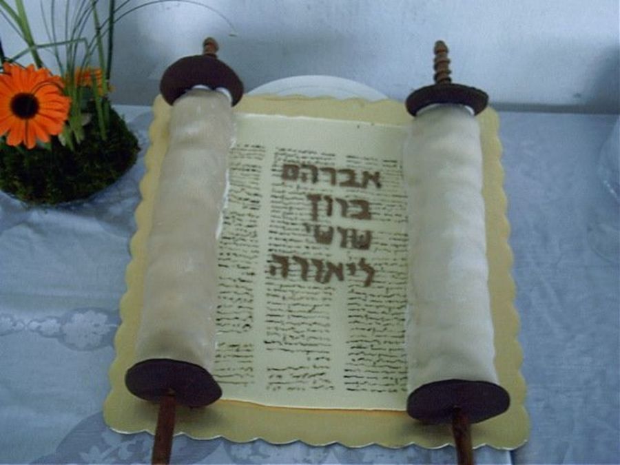 its a chocolate plate simulating teh scroll of the torah with the name of the kids made of fondant, the rolls are made with cake and the handles with fondant