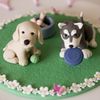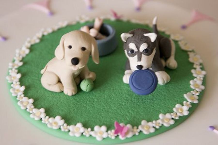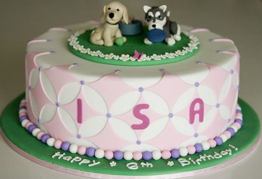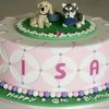 Made for a birthday girl named Isabella who loves her Nintendogs, and has a labrador named Goldie, and a husky named Fear. A 9 inch chocolate cake covered in fondant. Pattern inspired by a Hallmark gift bag. Dogs, toys, and dog bowl are clay on a fondant board.