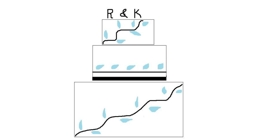 3 tier wedding cake, middle tier is a dummy. Neopolitan flavors, top is vanilla with chocolate mouse filling, bottom is chocolate with qhite chocolate filling and the groomscake is the strawberry with lemon filling. The pattern will "wrap" around the cake, alternating sides. Bride wanted simple elegance with vines and leaves and maybe a ribbon. Middle tier has the black ribbon border. Thanks for looking!