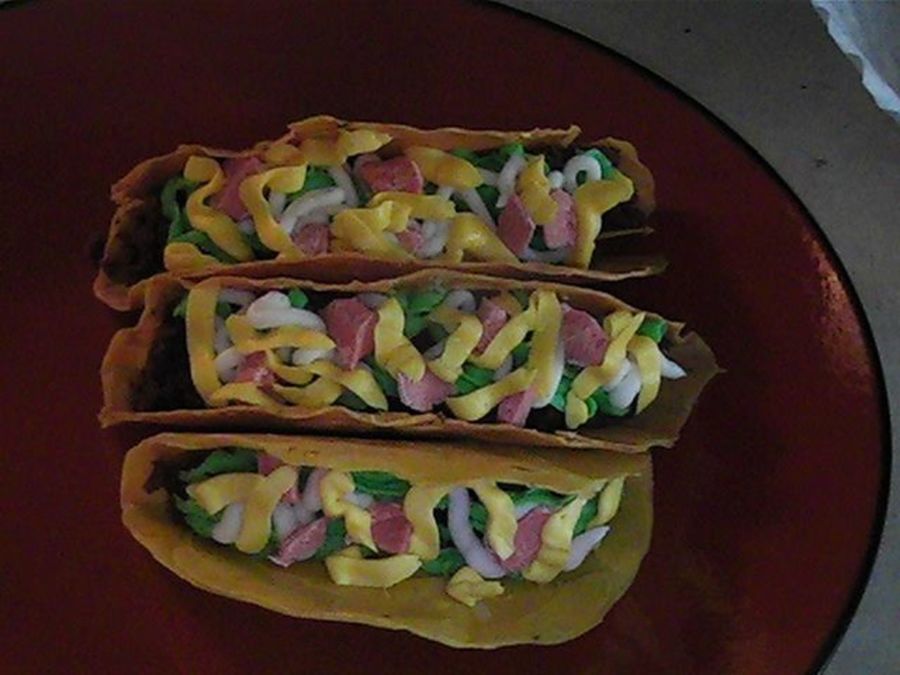 i used a white choco for the shells and crushed up choco. chips. The "meat" is devils food cake. Lettuce, cheese, and sour cream are buttercream frosting. The tomatos are vanilla candies melted down, and then diced. My hubby really loved this, and I was amazed how quick it all was!