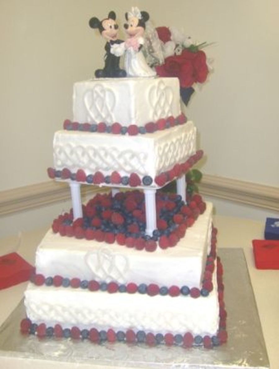 The bride asked for red, white and blue (7/7/07) and celtic, then after designing this brought me the Micky /Minnie cake top.....The celtic knotwork is SP brushed with luster dust,.....yes those are fresh raspberries and blueberries
