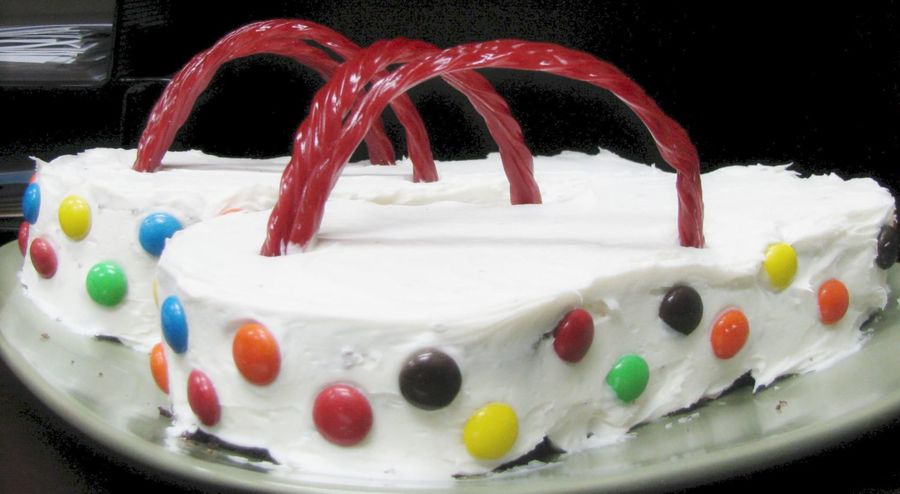 This is a flip flop cake that I made for a co-workers birthday. She LOVES flip flops. I think I could do a better job on it now that I have all of the great tips from the people on this site. I used m&ms for embellishments and Twizzlers for the straps.