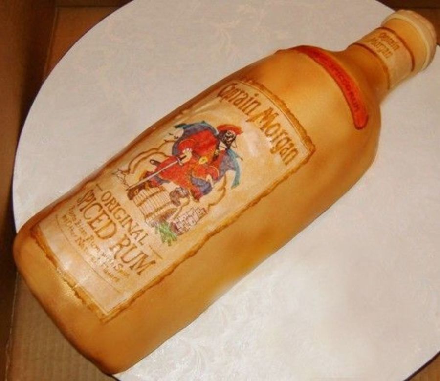3-D Captian Morgan's Spiced Rum made out of carrot cake, covered with creamcheese icing and fondant. used air brush to spray gold on bottle and hand drew the labels onto rice paper.