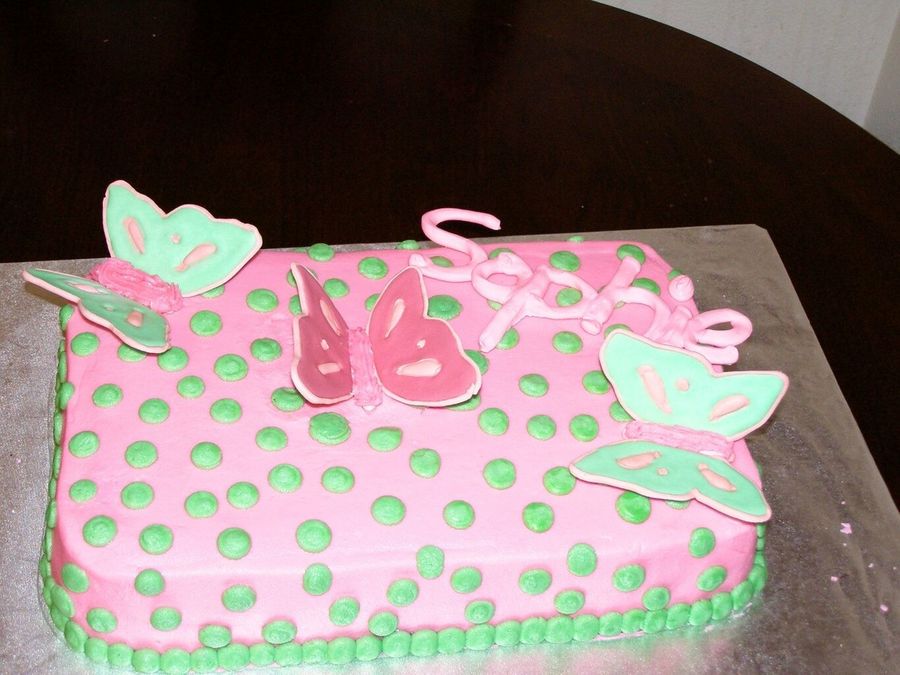 White cake w/bc butterflies & Sophie's name are sugar flow. I made a small 4in round for Sophie to smash(all BC) she loved the cake. Thanks for looking.