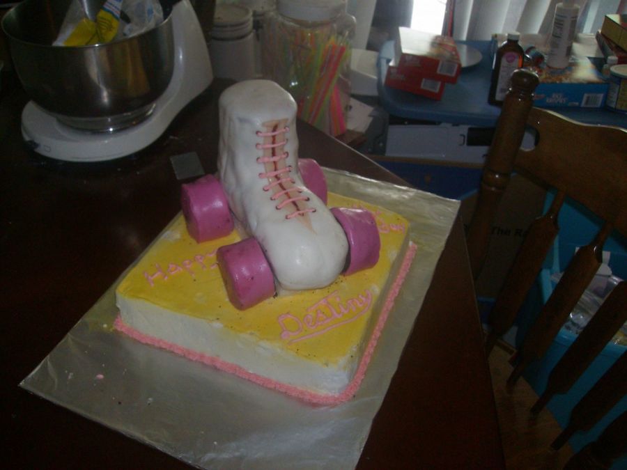 This is a rollerskate cake I made for my neice. She had her 7th Birthday party at the skating rink. the bottom layer is a marble cake covered with buttercreme icing and sprayed yellow. The skate is all chocolate cake held together with straws and wooden dowels - Covered in marshmallow fondant. It is held up by a peice of styrofoam. The wheels are also chocolate cake covered in fondant, held in place with wooden dowels.