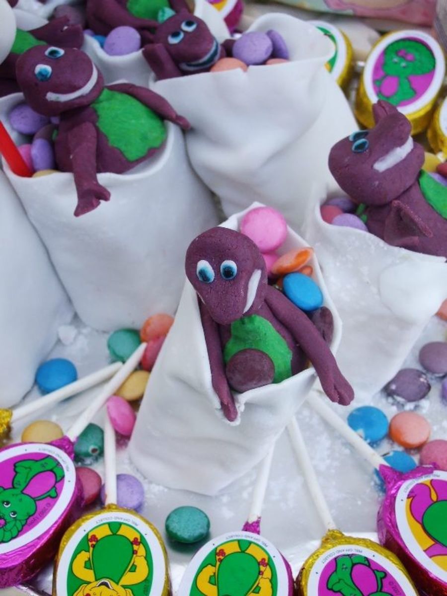 Each Barney is sitting on a cake of it's own. Little rectangular cakes, cover with fondant to look like bags. Barneys also made of Fondant and then you just put a few Smarties on so that it looks as if he is sitting in a bag full of Smarties.