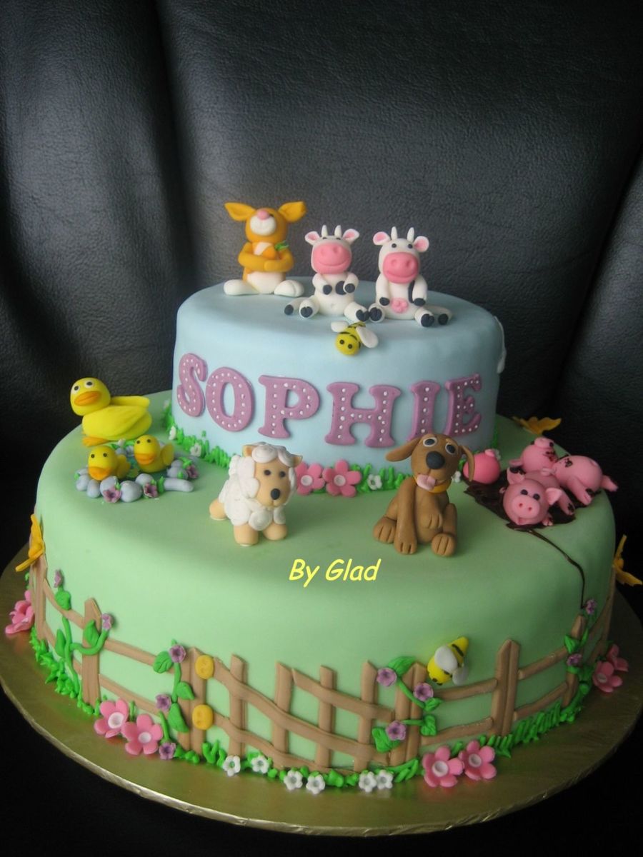 Cakes covered with fondant, figurines moulded with fondant mixed with gum-tex. Sophie's mom also requested for the bunny to be in the cake. Dog moulded based on Aine2's dog picture (thank you). The empty space behing the cows is 'reserved' for No 1 candle. Thanks for looking.