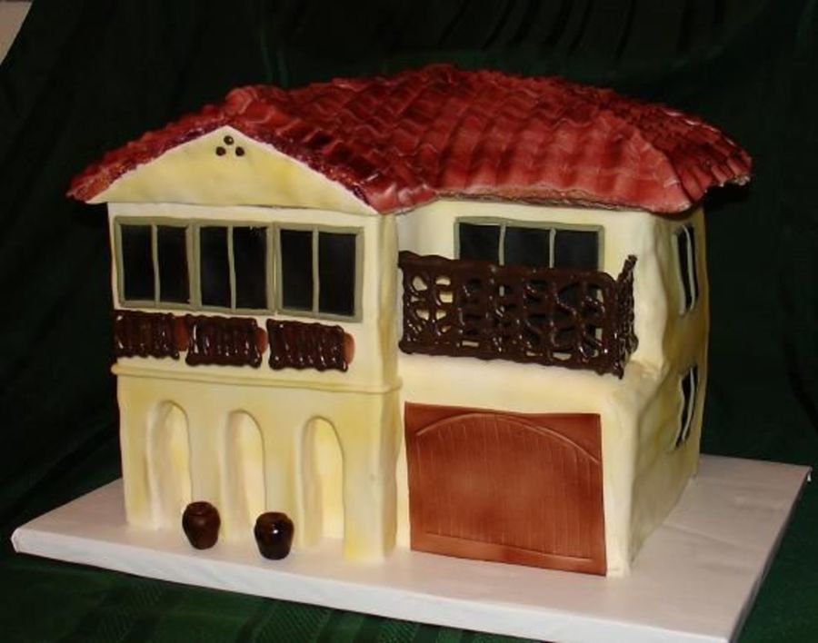 Five layers of 9x13 cake with one styrofoam dummy at the bottom. The front piece with the arches is also styrofoam. The roof is Rice Krispie treats covered in fondant spanish tile. It's all fondant, except for the balcony railing and flower boxes which are chocolate- I wanted something to look edible. :-) The was for a housewarming- I call it my "Salvadore Dali" version of their house, since the fondant did not cooperate and parts were buckling and sagging.