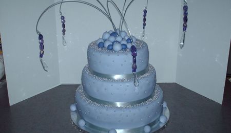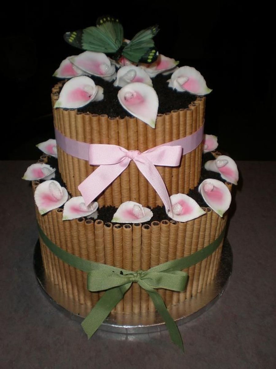 Cake is surrounded in cereal straws, and topped with cake crumbs and fondant calilies. Silk Ribbon accent