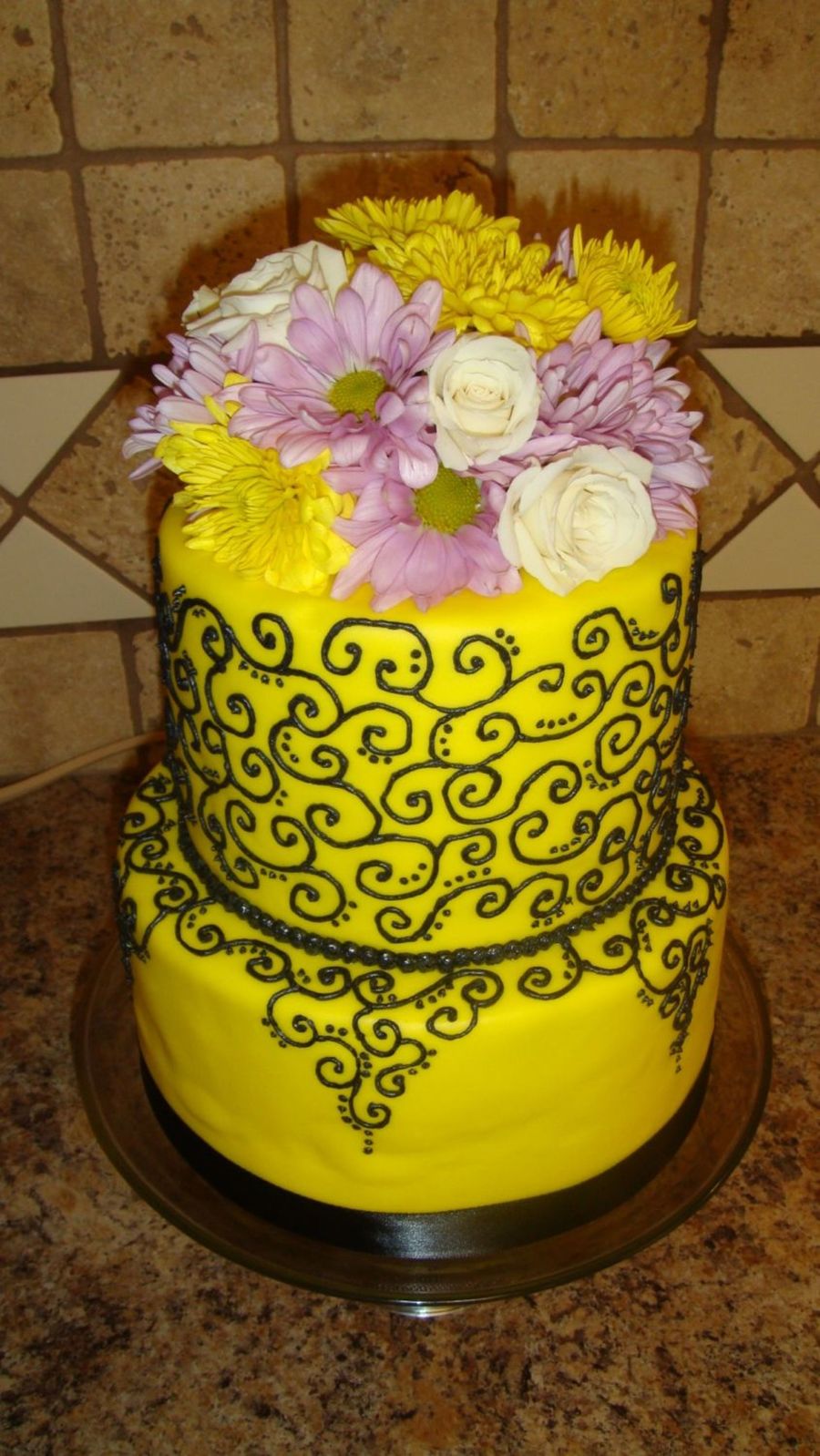 A wedding cake I made in April for a small intimate wedding. 6" and 8" round teirs of sour cream white cake with raspberry buttercream filling, covered in yellow MMF, free-hand black scroll work, satin ribbon on bottom teir with fresh flowers on top.