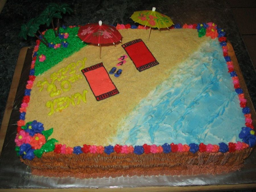 BEACH THEME FOR A CLIENT, CAKE CENTRAL INSPIRED FROM DIFFERENT CAKES. SAND IS GRAHAM CRACKERS AND SUGAR, SANDALS AND BEACH TOWELS ARE FROZEN BUTTERCREAM TRANSFERS
