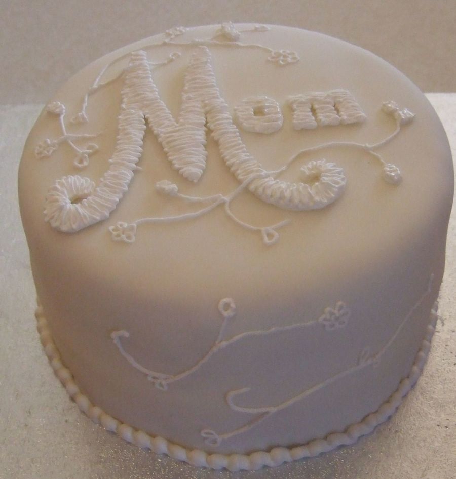 cake covered in fondant with piping (first attempt) and satin stitch on the lettering.