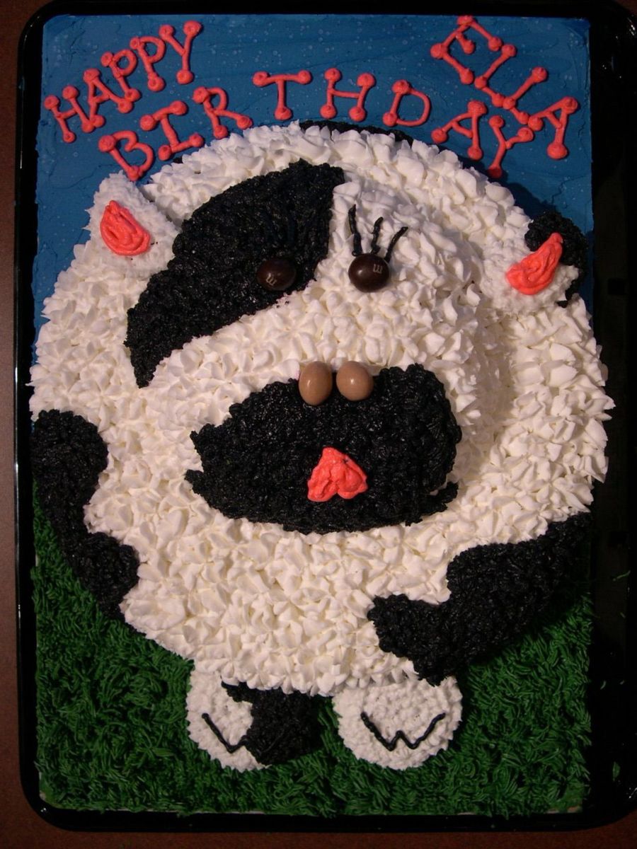 This cake was so much fun to do! 10" round cake for the "body" and 6" round for the "face". Halved cupcake tops for the ears and split cupcake bottom for the feet. I love the sky and grass, I think it really finishes the presentation! I can't wait to do another animal!