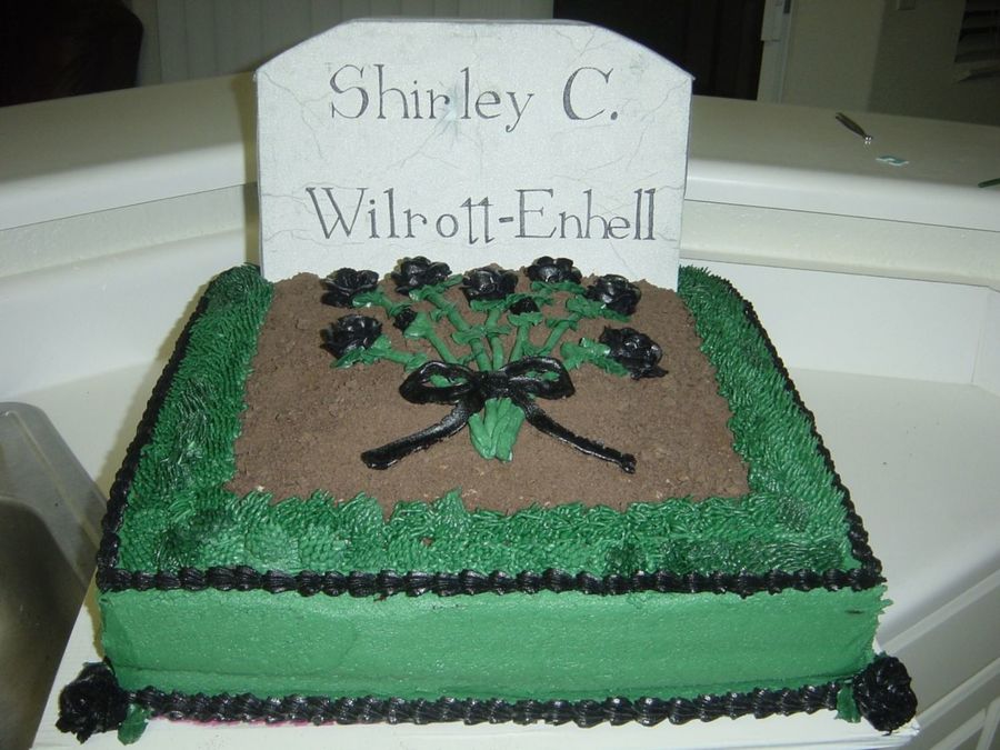Buttercream frosting, crumbled chocolate cookies to make "dirt", grass tip, and cardboard cut-out covered in foam paper for tombstone. Marble cake, but i dyed the white cake red so when it was cut into it looked cool and also dyed the vanilla bavarian red so it oozed out! Fun cake!