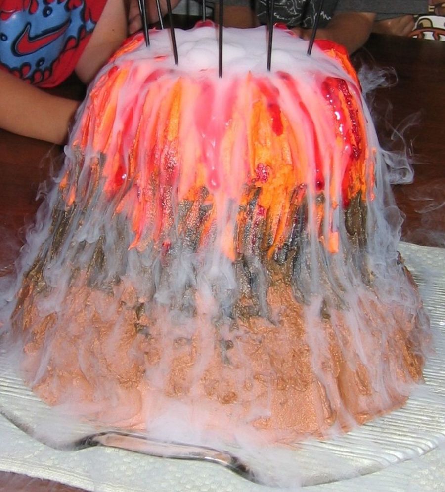 Here is my first attempt at a Volcano cake that my son insisted on..... The entire cake is BC frosting w/ red gel -- dry ice took on a life of it's own. Enjoy
