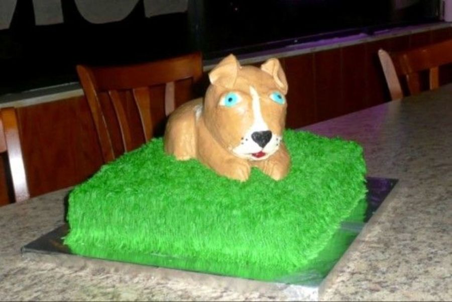 This cake was made for my sons' birthday. He wanted it to resemble our 5moth old pit. the cake was chocolate with a chocolate mouse filling the dog is also choclate cake all done in buttercream.