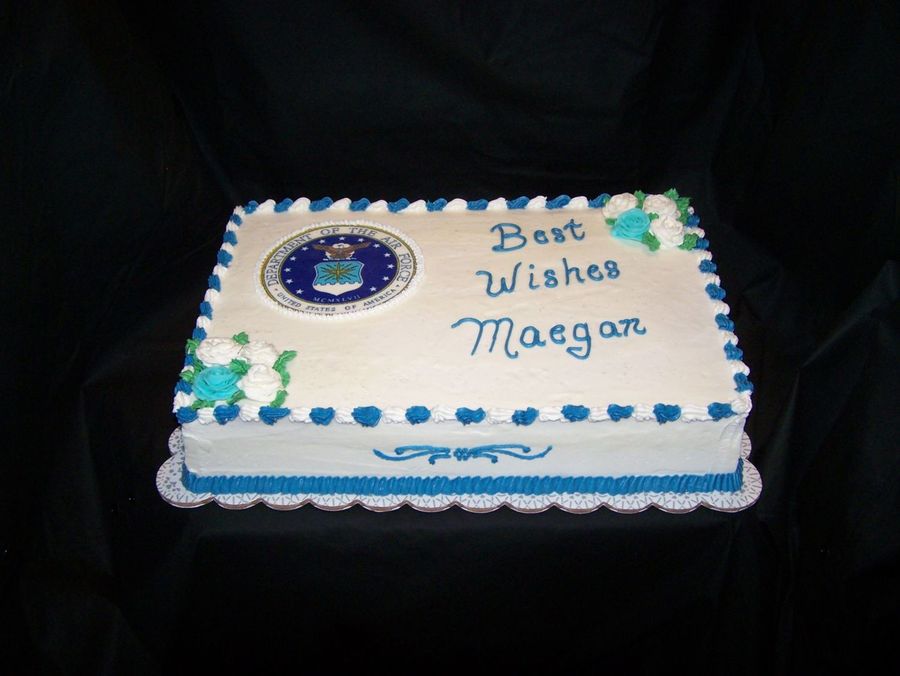 this was a marble 12 X 18 2 layer w/ vanilla buttercream icing cake for someone headed off to basic and just graduated. edible image logo.