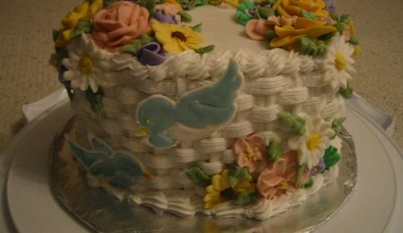 8" round cake with buttercream frosting. I used color flow for the graduation hat and tassle. I piped border around hat and tassle with school color. I rolled paper to make diploma and tied with ribbon in school color.