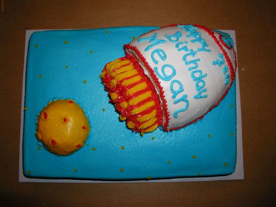 My friends daughter wanted a yellow moon with a rocket. I was inspired by a couple of cakes on cc. by: Nancyap's rocket to the moon and APCakes's Boy scout space cake. Thanks for the inspiration.