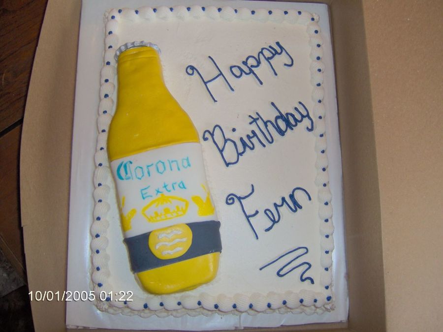 Corona Bottle made from a loaf pan. (white cake mix) covered in fondant, MMF and also used food writers. Sheet cake 1/2 chocolate and 1/2 white with buttercream icing.