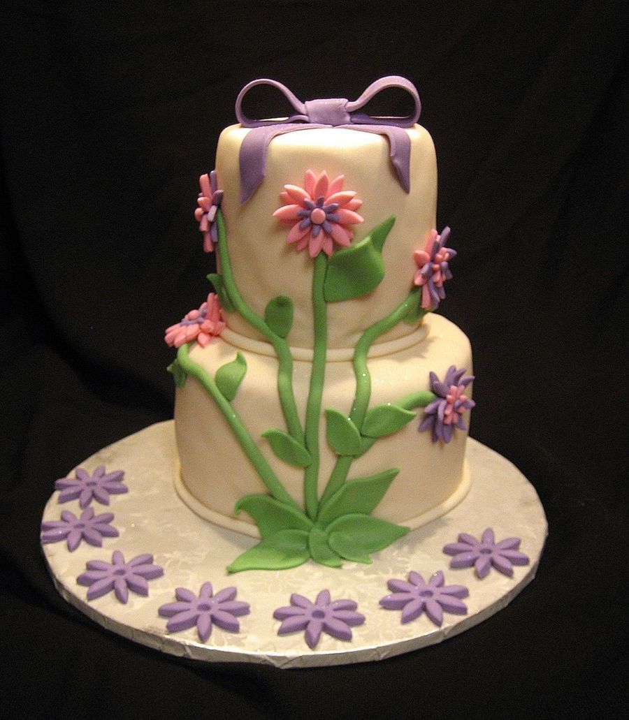 This was a cake I created for a little girl's 7th birthday. She loves flowers and the colors pink and purple. The design was taken from a cake that was featured on the cover of a recent edition of Mailbox News. The cake is covered in fondant and the daisies on the cake board hold seven candles.