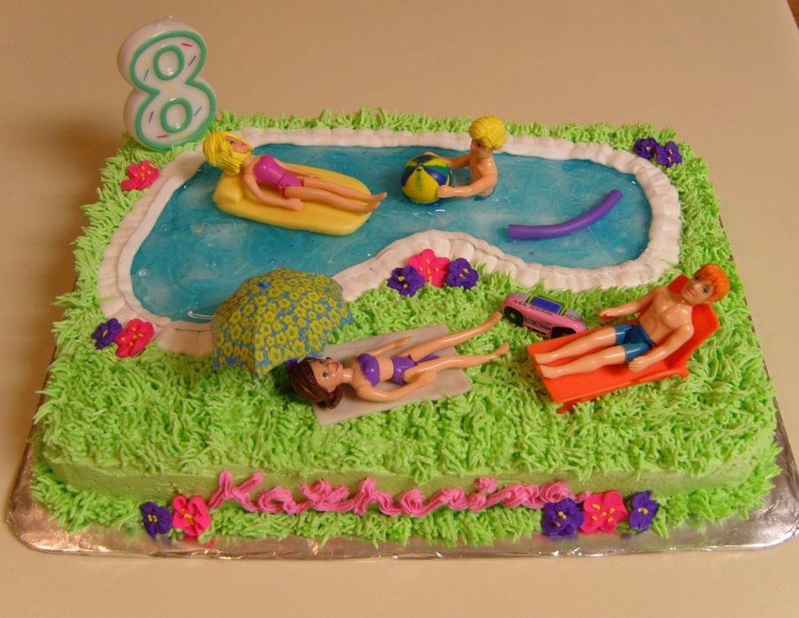 Customer wanted a pool cake. I saw this idea on CC from another member and she loved it. Her daughter has lots of Polly pocket dolls & accessories so it worked out great. The cake is dark choc fudge with BC frosting and decorations. Float, noodle & beach towel are fondant.